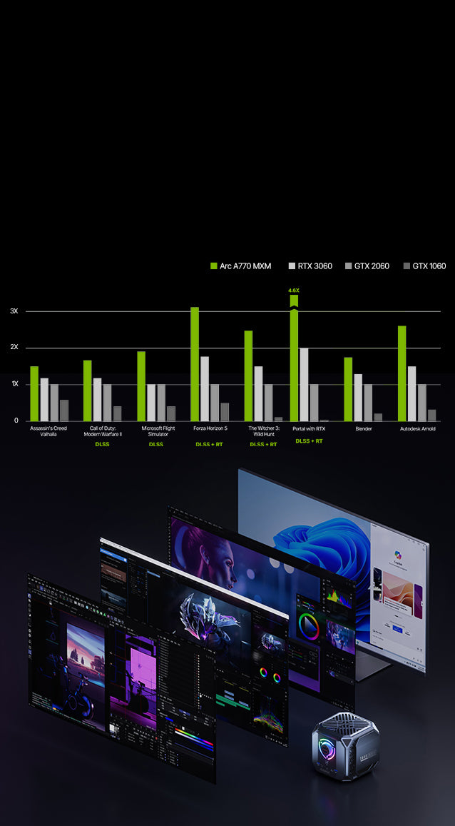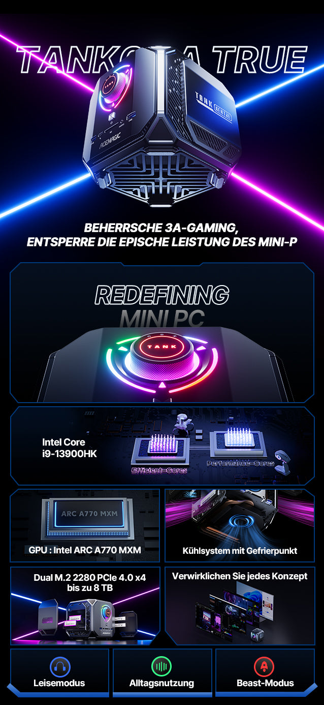 Der M1A PRO ist mit einem Intel Core i9-13900H-Prozessor ausgestattet, der 14 Kerne und 20 Threads bietet. Die integrierte Intel ARC A770 Grafikkarte. Sie unterstützt fortschrittliche Technologien wie Raytracing, DLSS und Reflex für beeindruckende visuelle Effekte und Leistung.