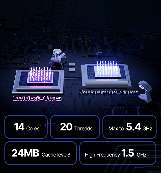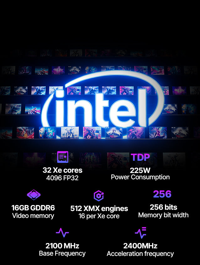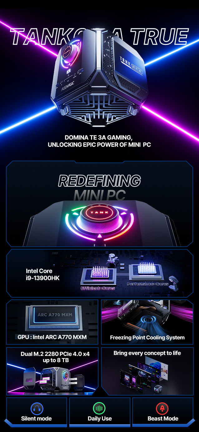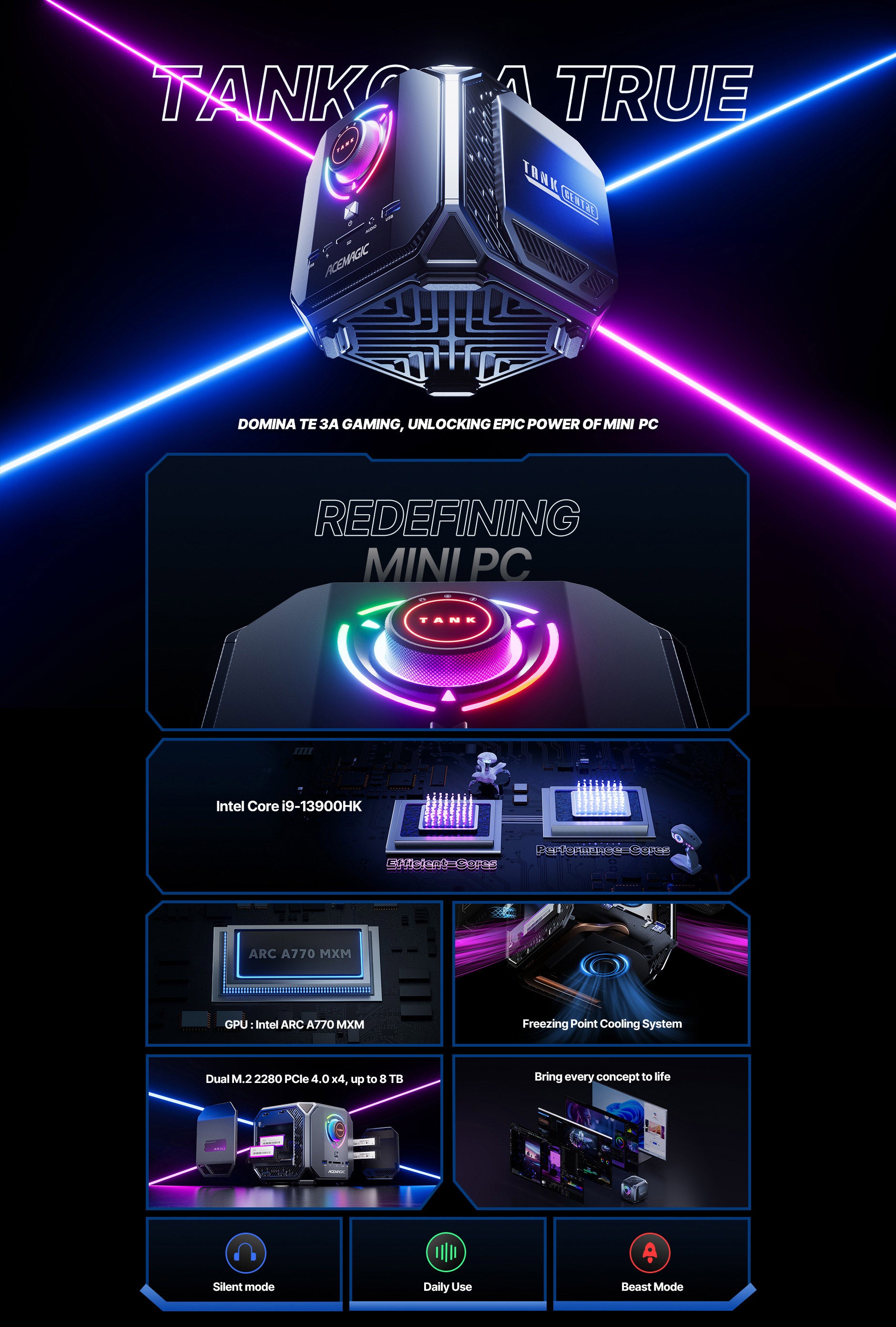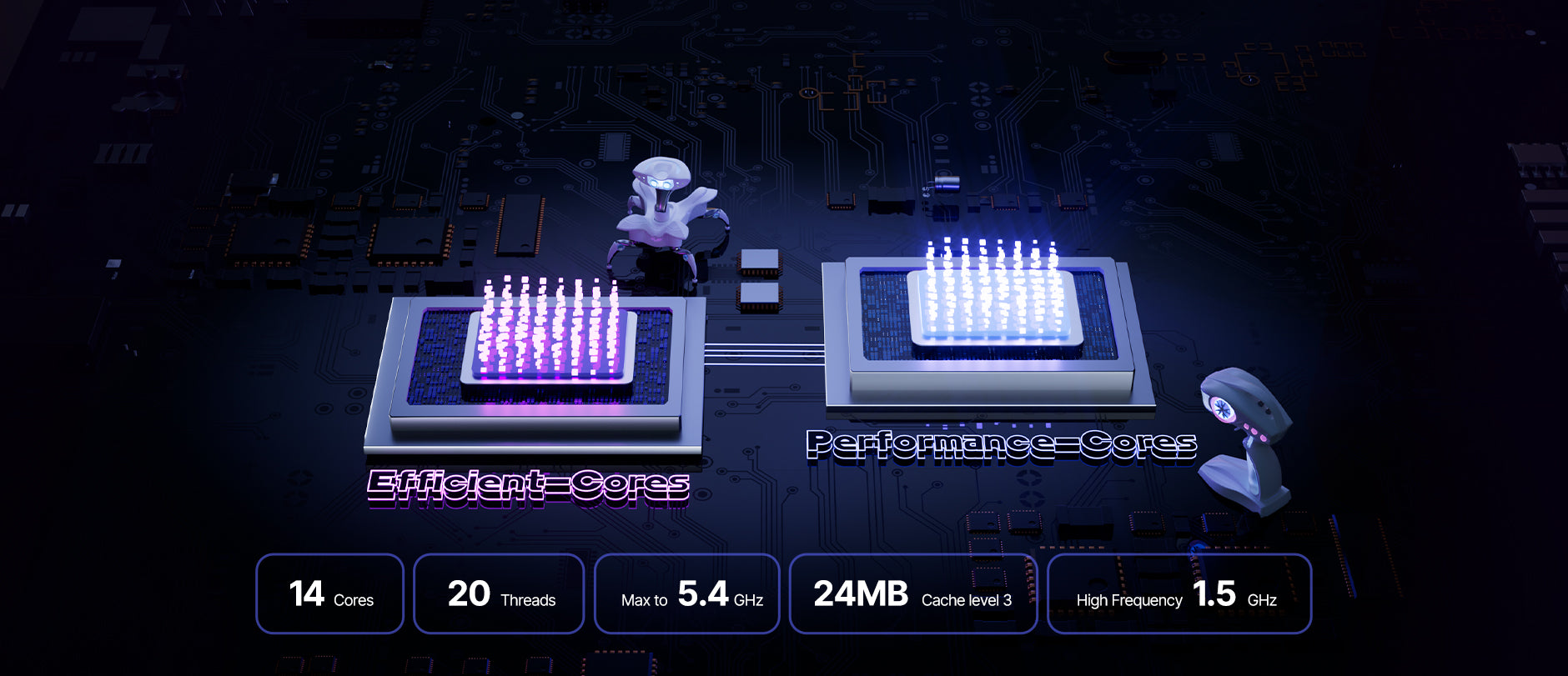 The M1A PRO is powered by an Intel Core i9-13900H processor with 14 cores and 20 threads. It features the integrated Intel ARC A770 graphics card and supports advanced technologies such as Ray Tracing, DLSS, and Reflex for stunning visuals and high performance.