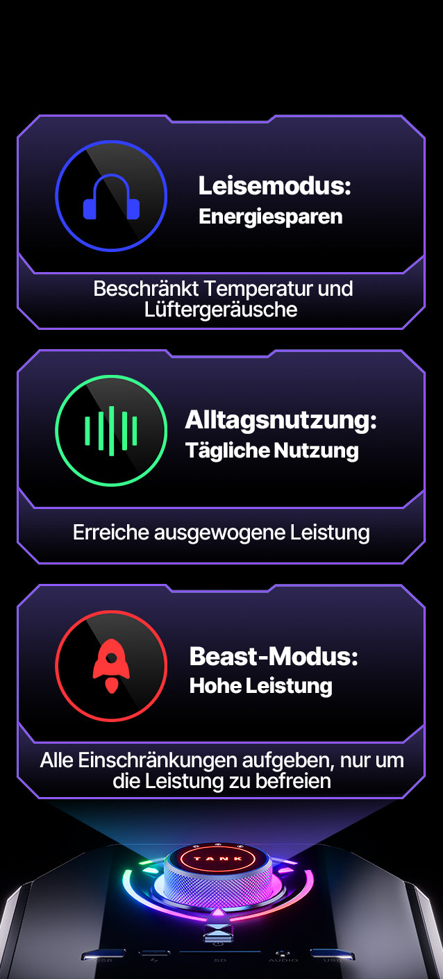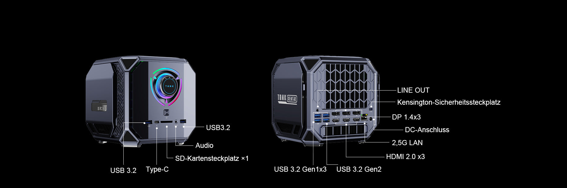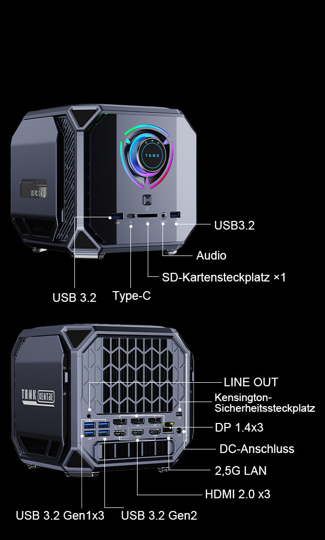 10 M/100 M/1000 M/2,5 Gbps adaptiv RJ45 Gigabit Ethernet*2 USB 3.2 Gen 2 Typ-A*3 USB 3.2 Gen 1 Typ-A*3 USB 4.0 Typ-C*1 (8K@60Hz) DC-Eingangsbuchse*1 HDMI 2.0*3 (4K@60Hz) DP 2.0*3 (8K@60Hz) 3,5-mm-Audiobuchse*2 |