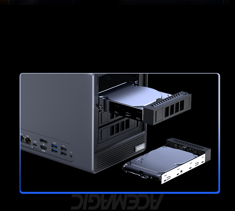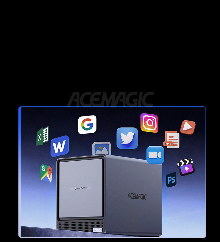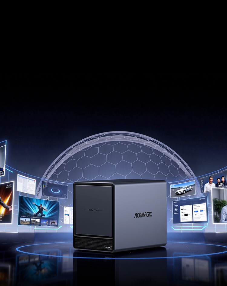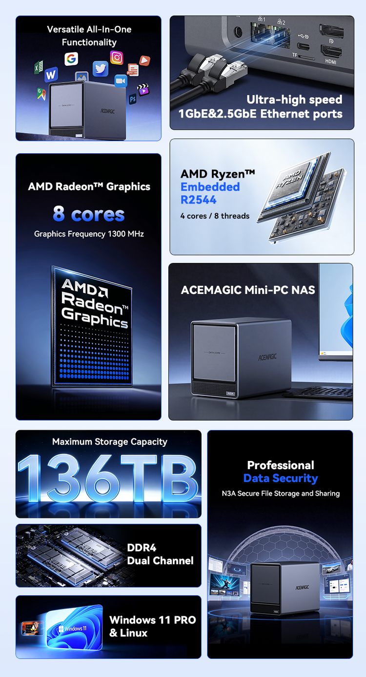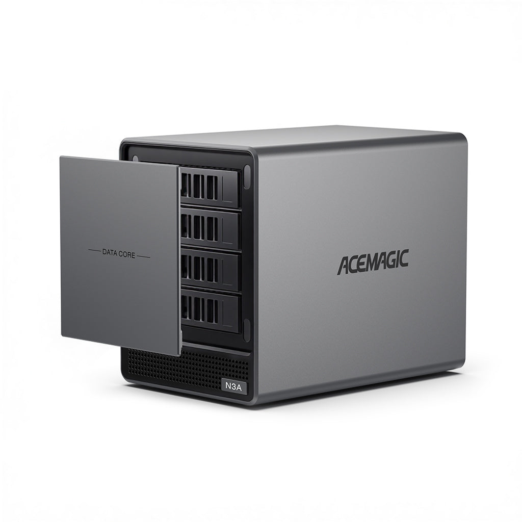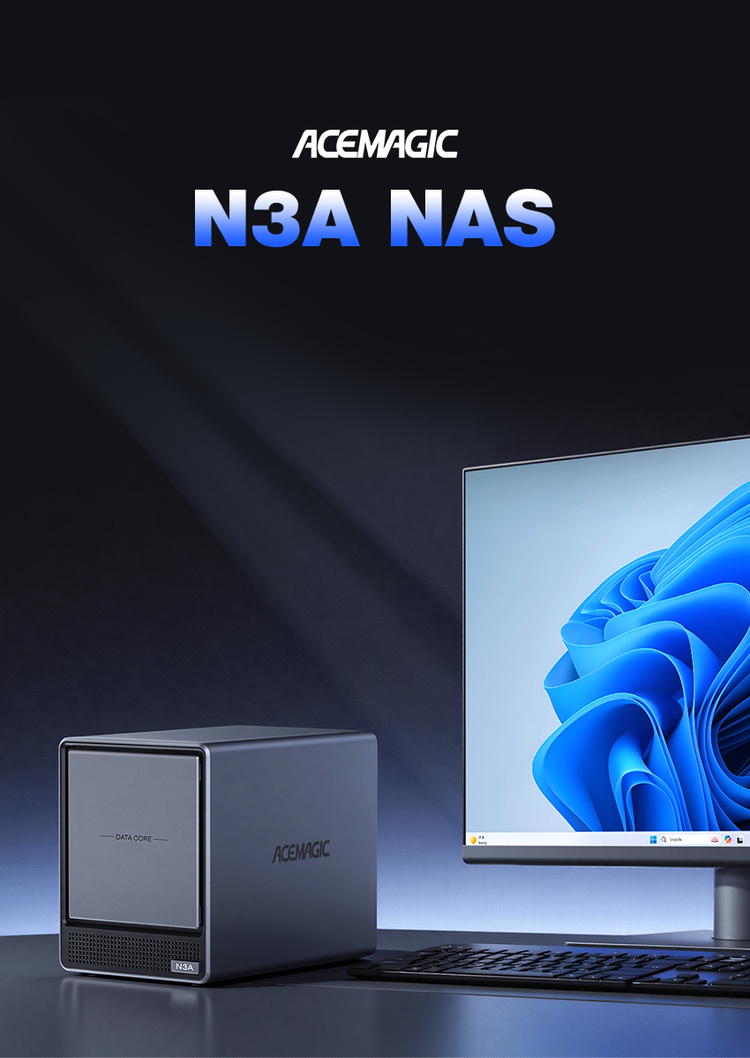 ACEMAGIC N3A NAS Mini PC is a powerful and flexible system powered by the AMD Ryzen™ Embedded R2544 processor, designed for reliable performance in storage and multitasking scenarios. It supports dual-channel DDR4 SO-DIMM memory (up to 64GB, 3200 MT/s) and offers versatile storage options with dual M.2 NVMe PCIe 3.0 ×4 slots and a SATA 3.0 interface, with total capacity expandable up to 8TB depending on configuration. It also features practical functions such as RTC scheduled power-on and automatic power-on when power is restored.