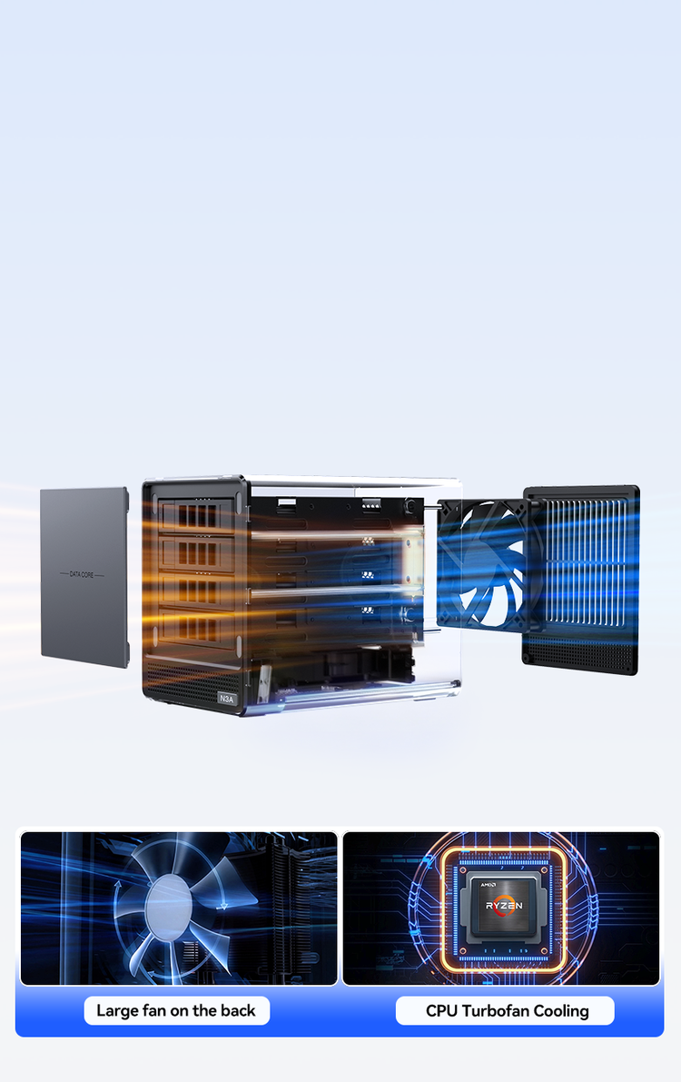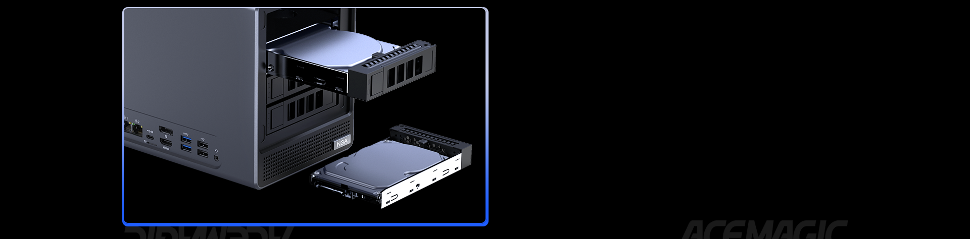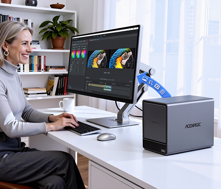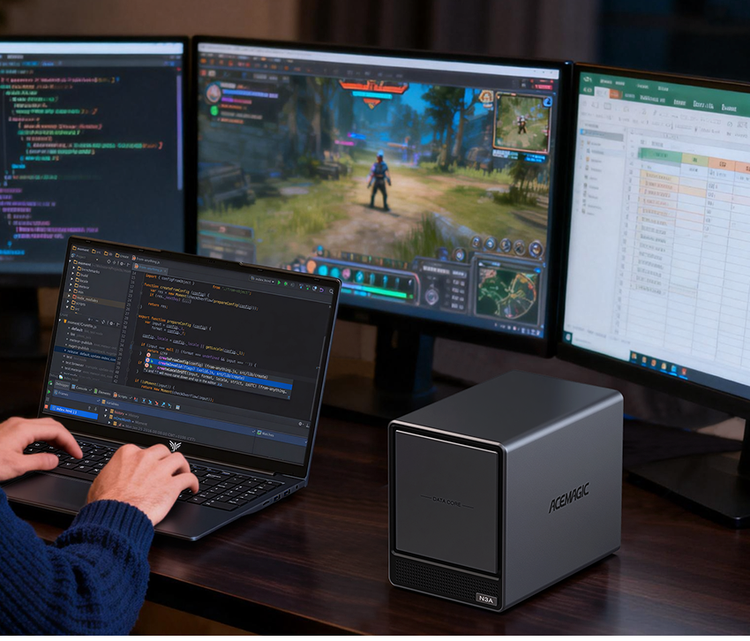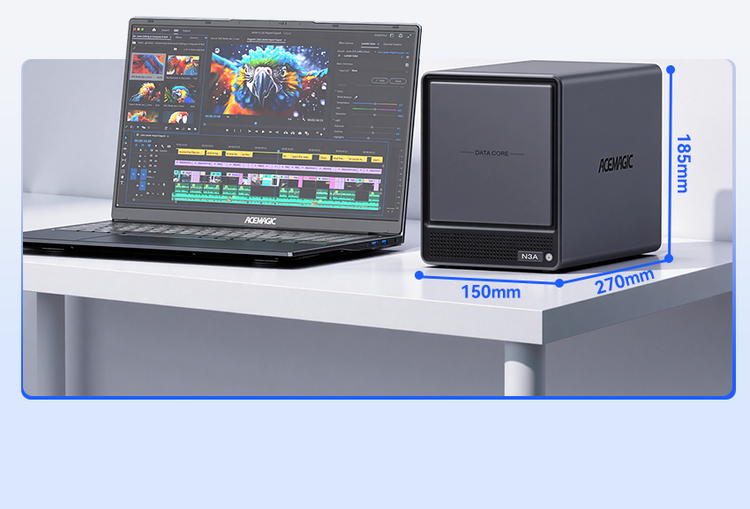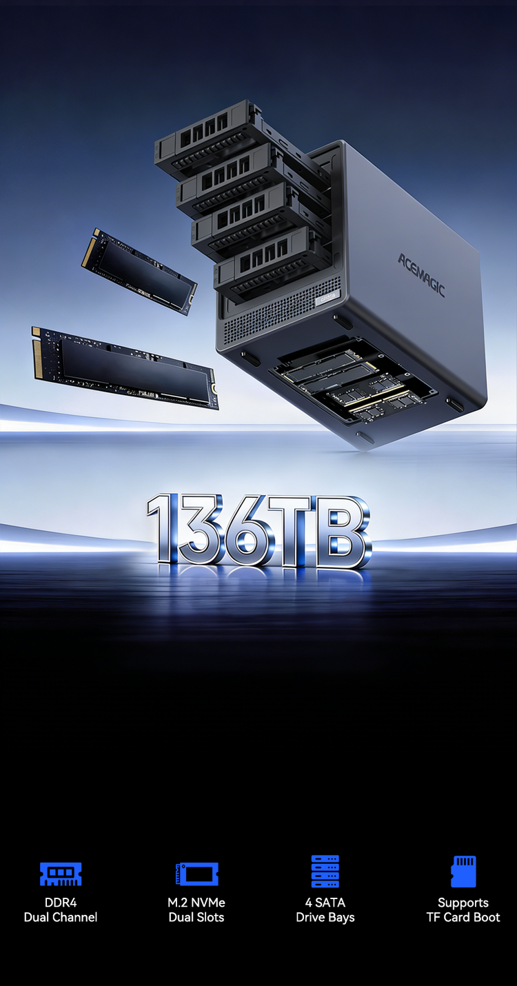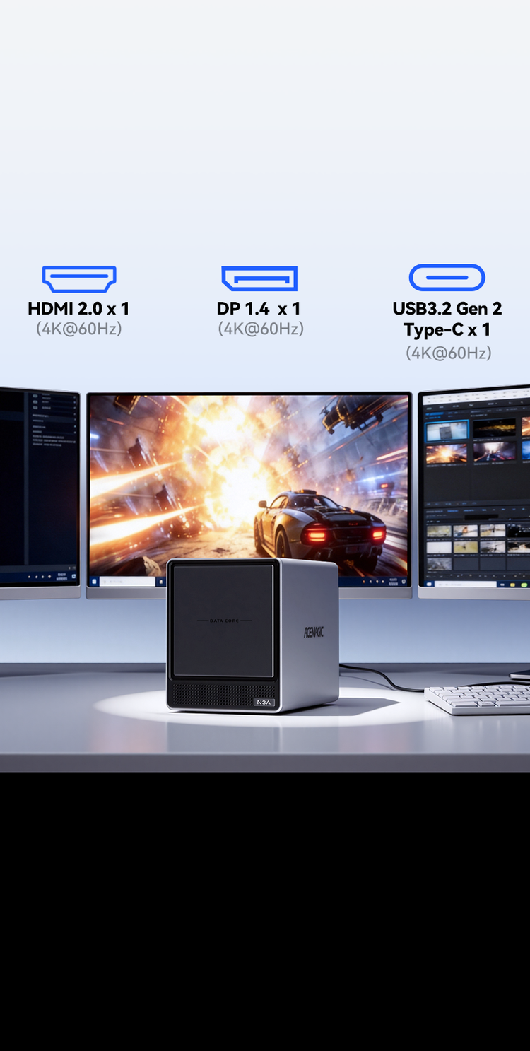 ACEMAGIC N3A NAS Mini PC is a powerful and flexible system powered by the AMD Ryzen™ Embedded R2544 processor, designed for reliable performance in storage and multitasking scenarios. It supports dual-channel DDR4 SO-DIMM memory (up to 64GB, 3200 MT/s) and offers versatile storage options with dual M.2 NVMe PCIe 3.0 ×4 slots and a SATA 3.0 interface, with total capacity expandable up to 8TB depending on configuration. It also features practical functions such as RTC scheduled power-on and automatic power-on when power is restored.