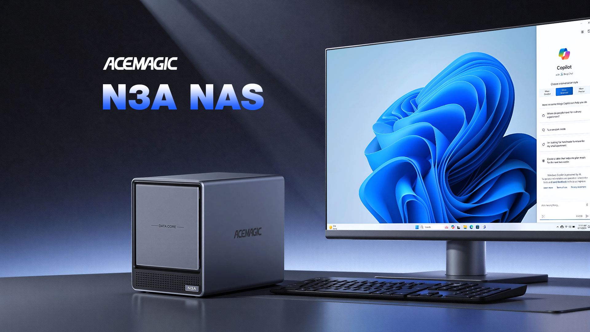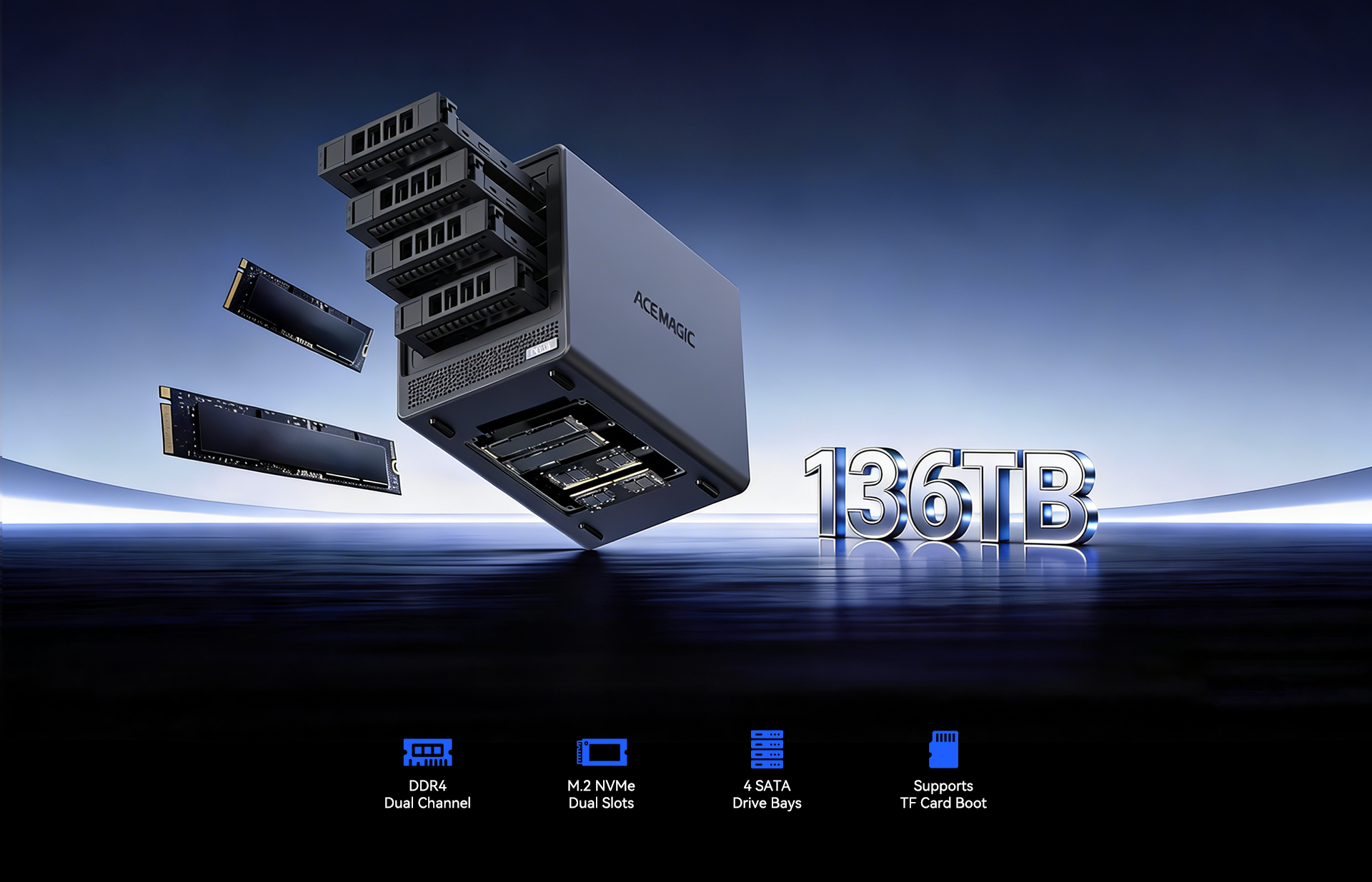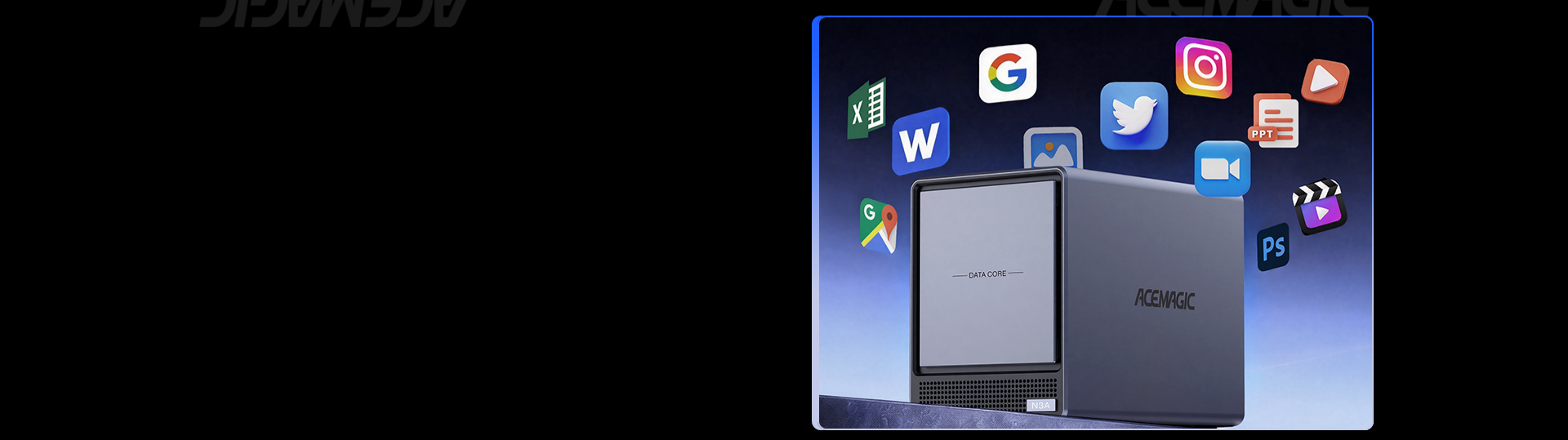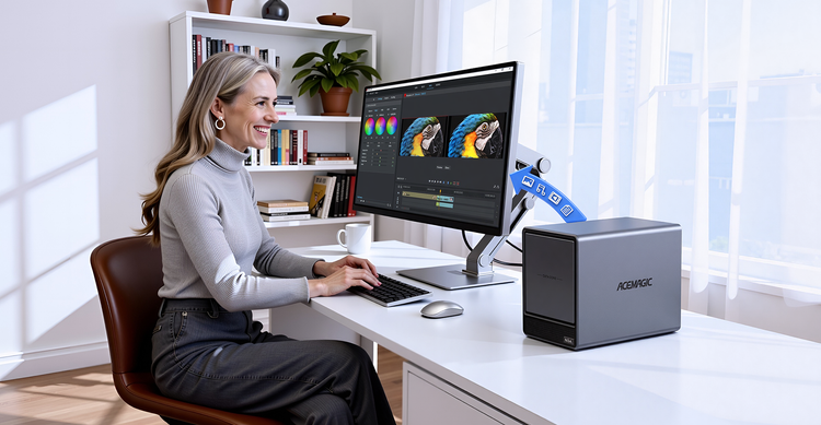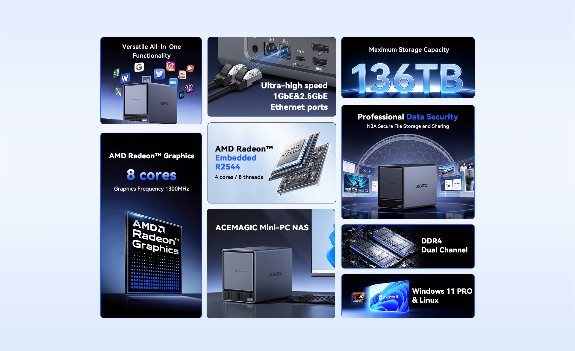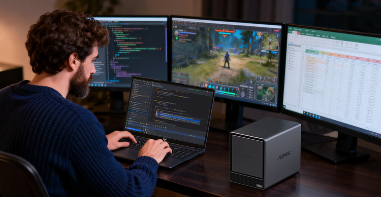 ACEMAGIC N3A NAS Mini PC is a powerful and flexible system powered by the AMD Ryzen™ Embedded R2544 processor, designed for reliable performance in storage and multitasking scenarios. It supports dual-channel DDR4 SO-DIMM memory (up to 64GB, 3200 MT/s) and offers versatile storage options with dual M.2 NVMe PCIe 3.0 ×4 slots and a SATA 3.0 interface, with total capacity expandable up to 8TB depending on configuration. It also features practical functions such as RTC scheduled power-on and automatic power-on when power is restored.