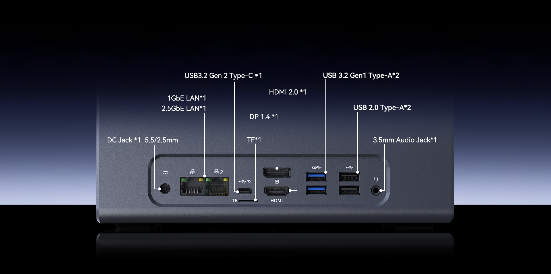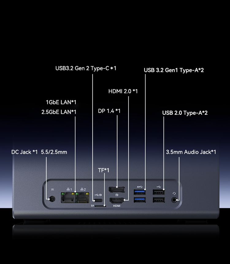 | Ports & Buttons | 10/100/1000Mbps Adaptive RJ45 Gigabit Ethernet ×1 10/100/1000/2.5Gbps Adaptive RJ45 Gigabit Ethernet ×1 USB 3.2 Gen1 Type-A ×2 (5Gbps) USB 2.0 Type-A ×2 USB 3.2 Gen2 Type-C ×1 (max 10Gbps data transfer, DP 1.4 [4K@60Hz]) DC IN ×1 HDMI 2.0 *1 Max:4096*2160@60Hz DP 1.4 *1 Max:4096*2160@60Hz 3.5mm Audio Jack ×1 Power Button ×1 |