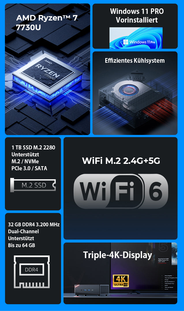 ACEMAGIC AM06 Pro ist ein leistungsstarker Minicomputer, der mit einem AMD Ryzen 7 7730U/5700U/5800U/5825U-Prozessor ausgestattet ist. Er eignet sich gut für Spiele und verfügt über 32 GB DDR4-Speicher und eine 1 TB SSD (aufrüstbar auf maximal 2 TB). Er unterstützt dreifache 4K@60Hz-Displayausgabe über HDMI-, USB-C- und DP-Schnittstellen. Darüber hinaus verfügt er über zwei Ethernet-Anschlüsse und WiFi 6 und läuft unter dem Betriebssystem Windows 11.