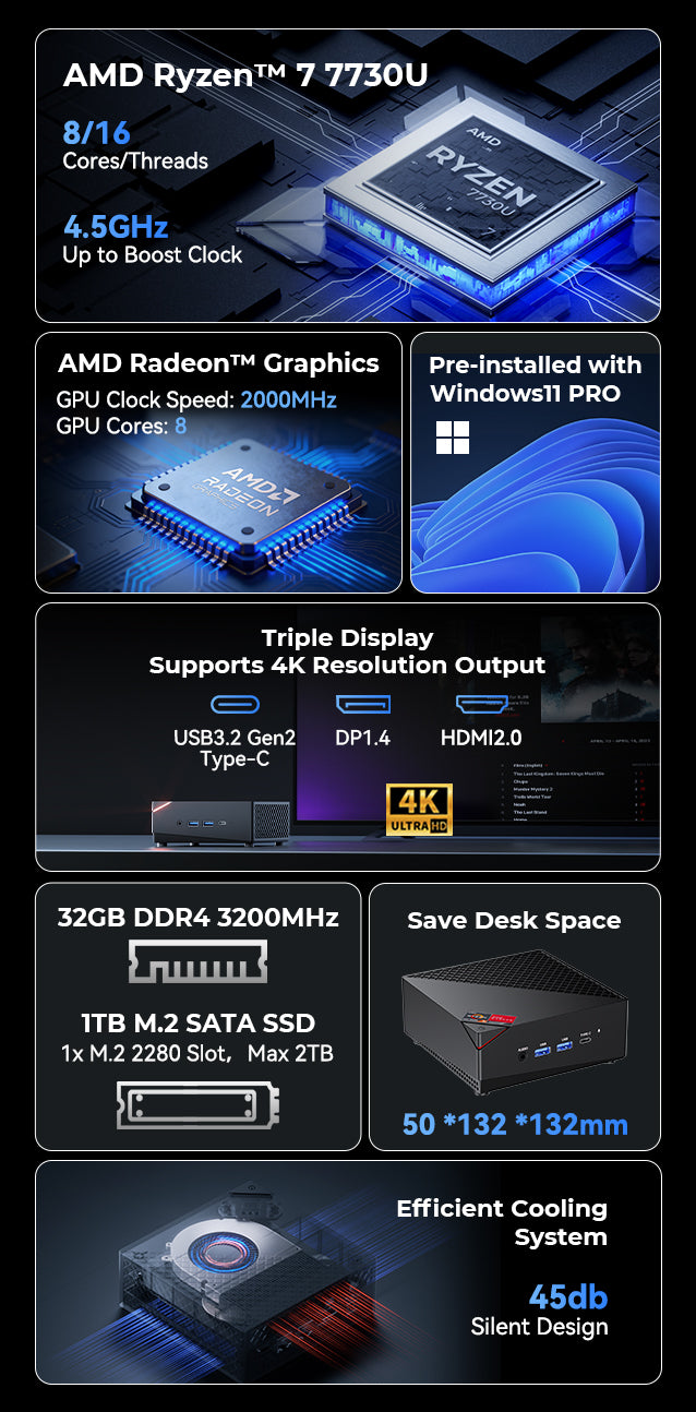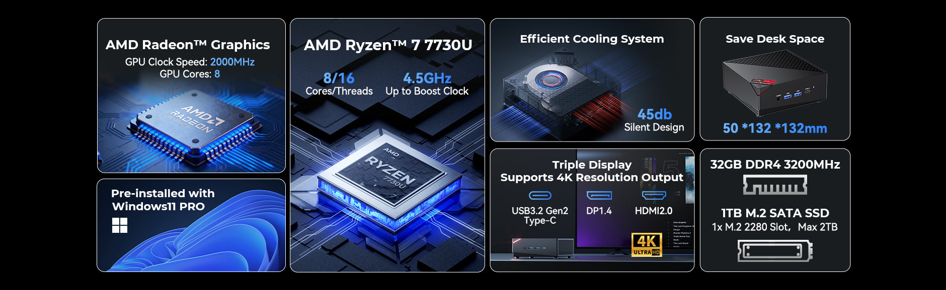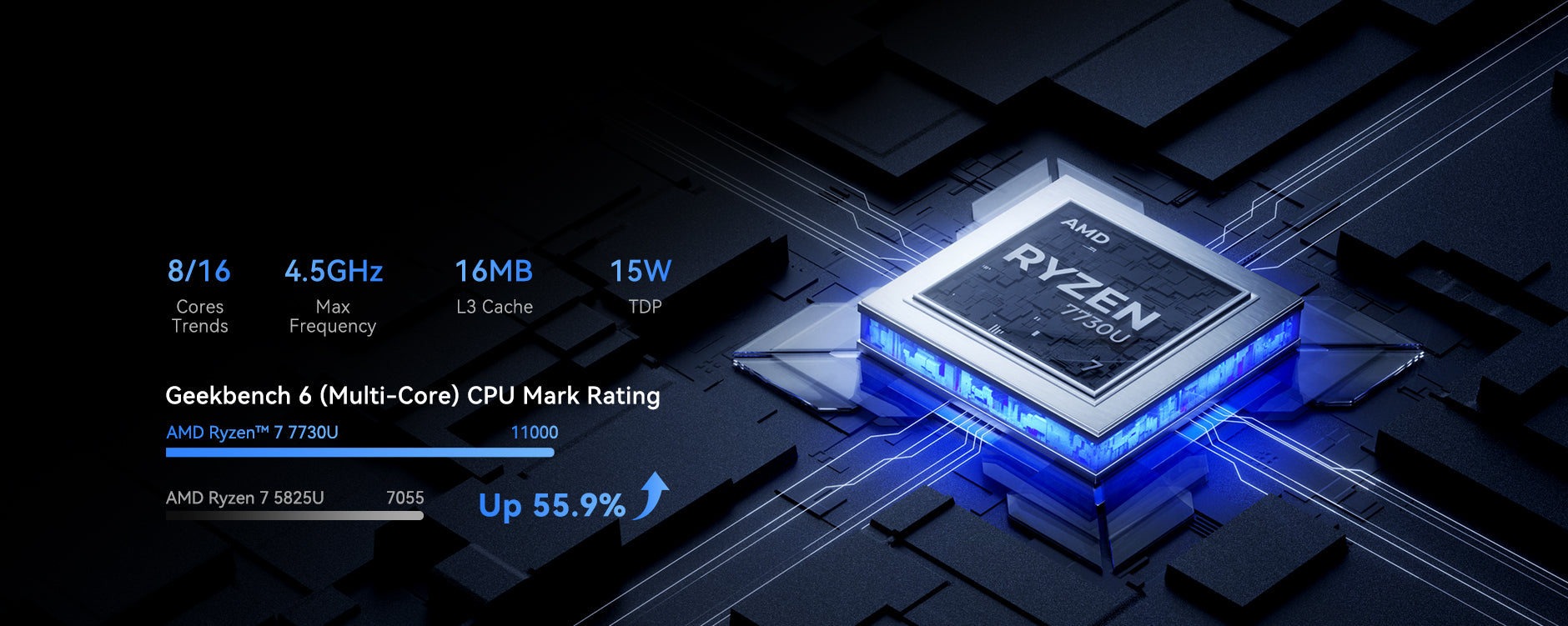 | Processor | AMD Ryzen™ 7 7730U Processor, 8 Cores/16 Threads (Zen3 architecture, TSMC 7nm FinFET process, 16MB L3 Cache, Base frequency 2.0GHz, Turbo frequency up to 4.5GHz) |