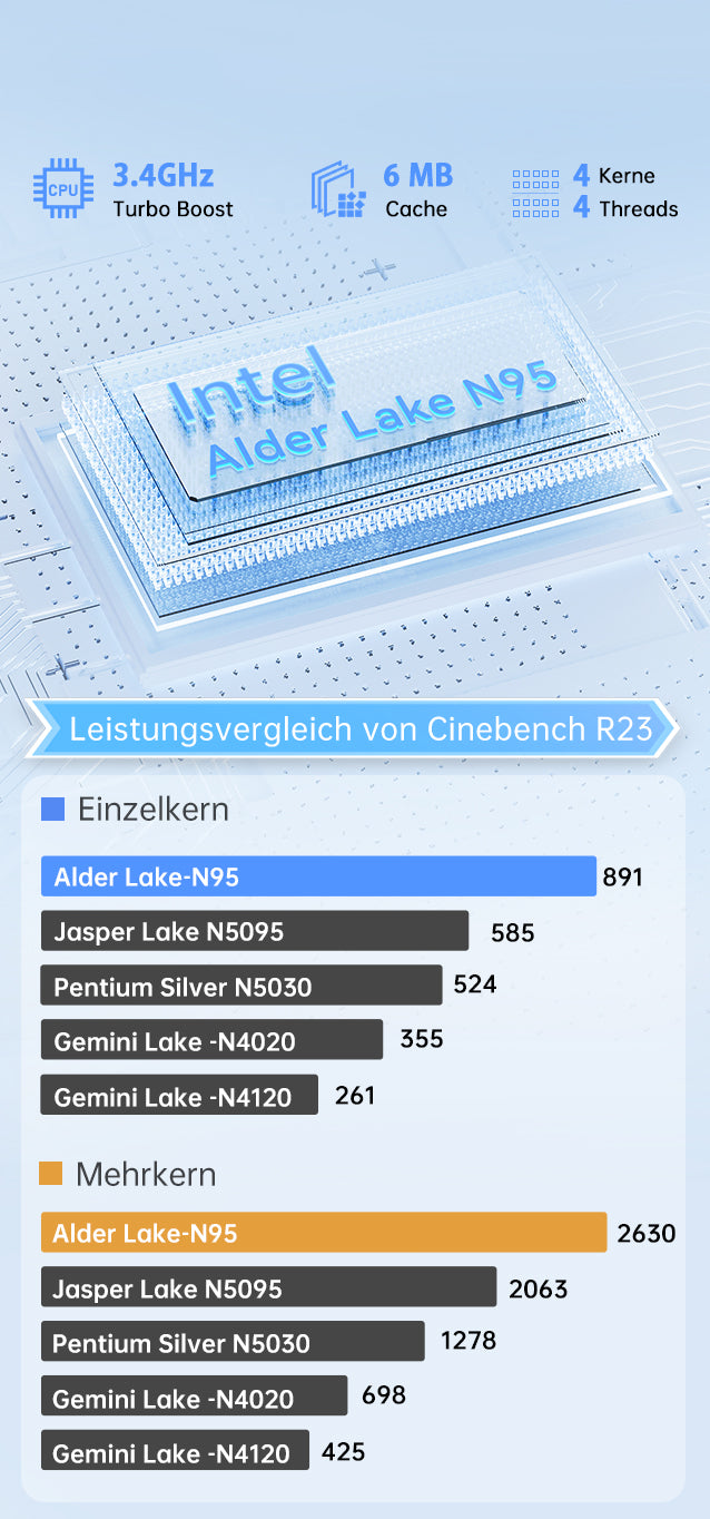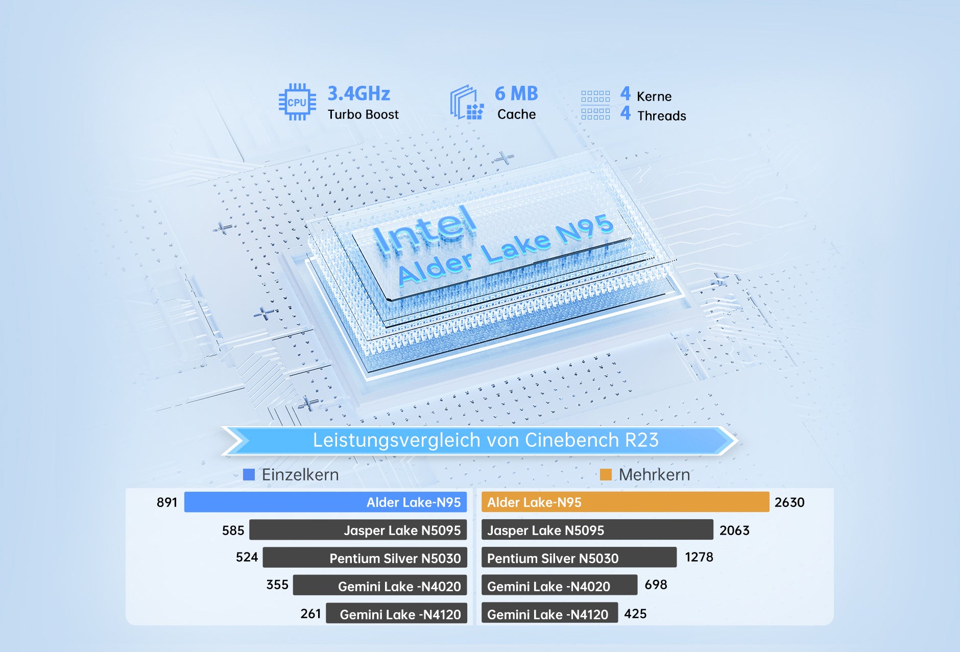 | Prozessor | Intel® Alder N N95-Prozessor, 4 Kerne/4 Threads, 6 MB Cache, Basisfrequenz 1,7 GHz, Turbofrequenz bis zu 3,4 GHz |