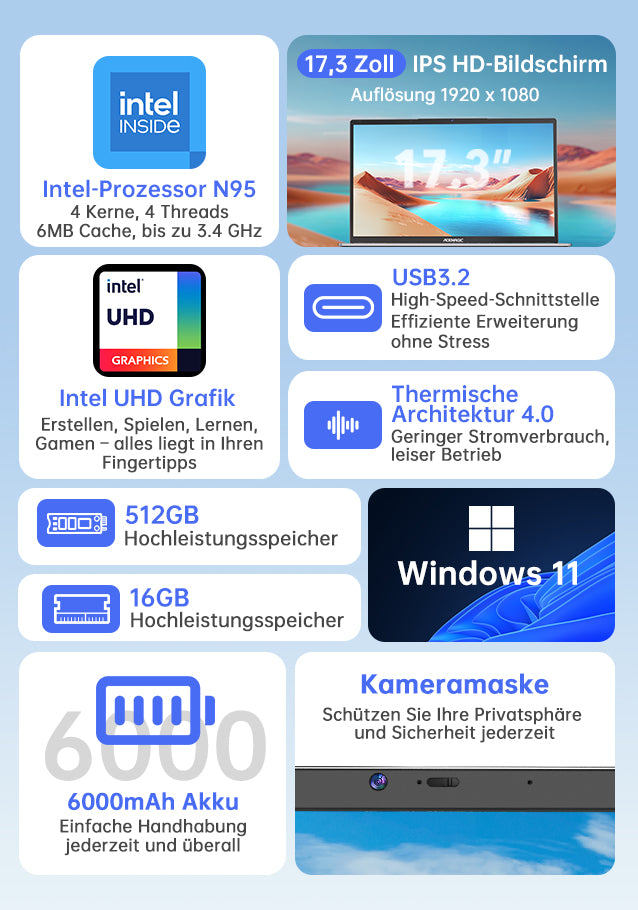 Angetrieben von einem Intel Alder Lake N95-Prozessor und integriertem 16 GB DDR4-Speicher sowie einer 512 GB M.2 NVME SSD läuft es schneller und reagiert schneller, sodass Sie mehr Dateien speichern können. Der 17,3 Zoll große IPS-Bildschirm sorgt für eine einfache Anzeige und erhöht die Arbeitseffizienz. Sie können 8 Stunden lang arbeiten oder spielen, ohne befürchten zu müssen, dass der Akku leer wird. Ausgestattet mit einer Kameramaskenfunktion, die zum Schutz Ihrer Privatsphäre beiträgt.