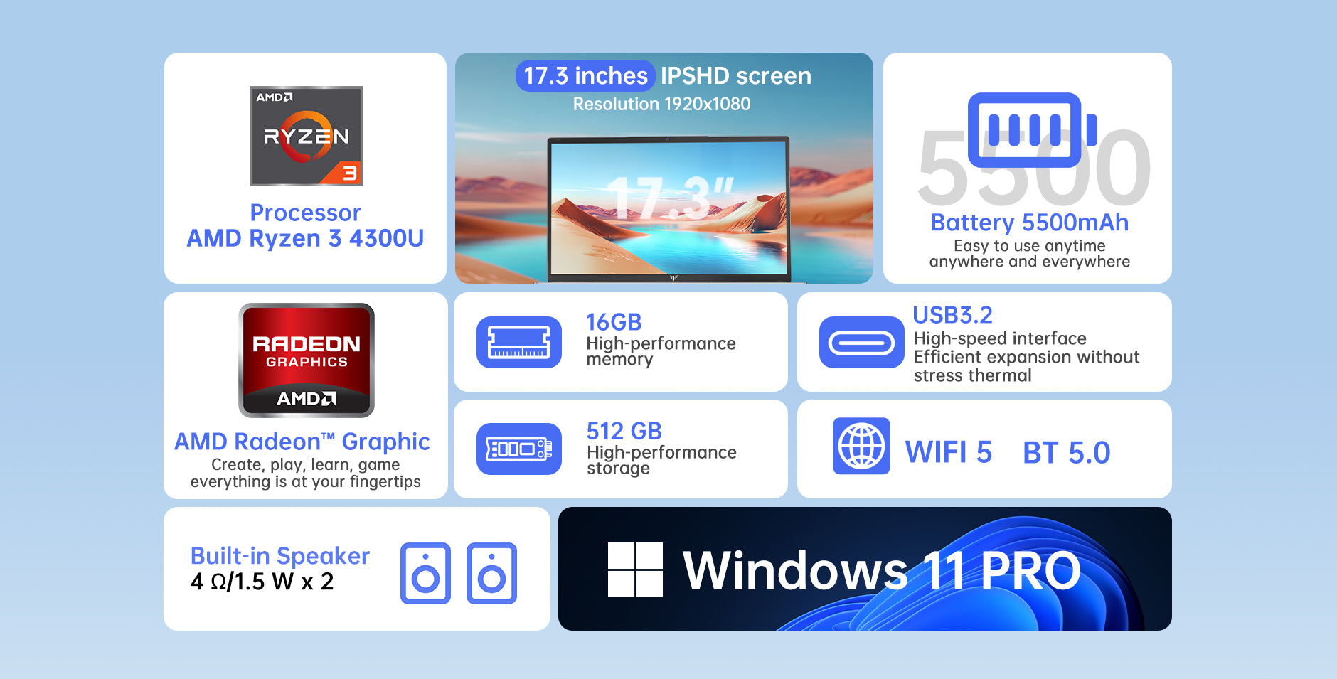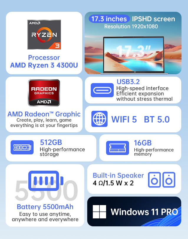 Powered by an AMD Ryzen 3 4300U processor with 16 GB DDR4 RAM and a 512 GB M.2 NVMe SSD, it delivers faster performance and responsiveness, allowing you to store more files. The 17.3-inch IPS display provides clear viewing and enhances productivity. You can work or play for up to 8 hours without worrying about the battery running out. It also features a camera cover function to help protect your privacy.