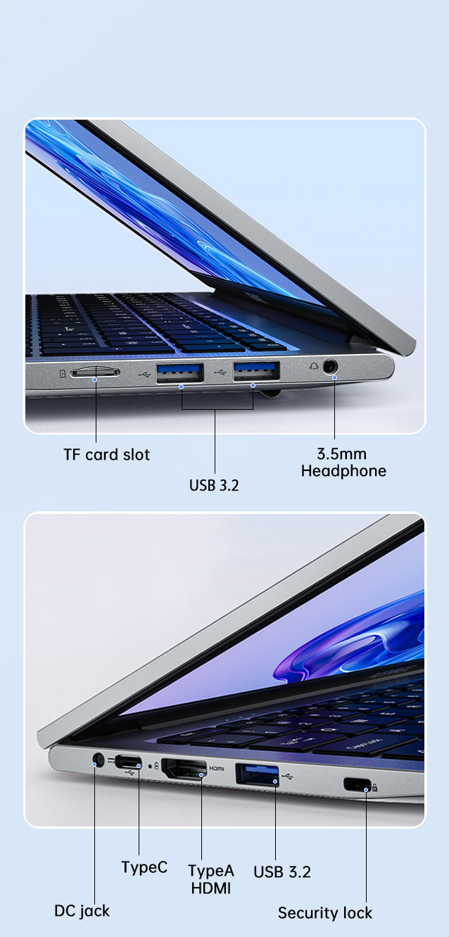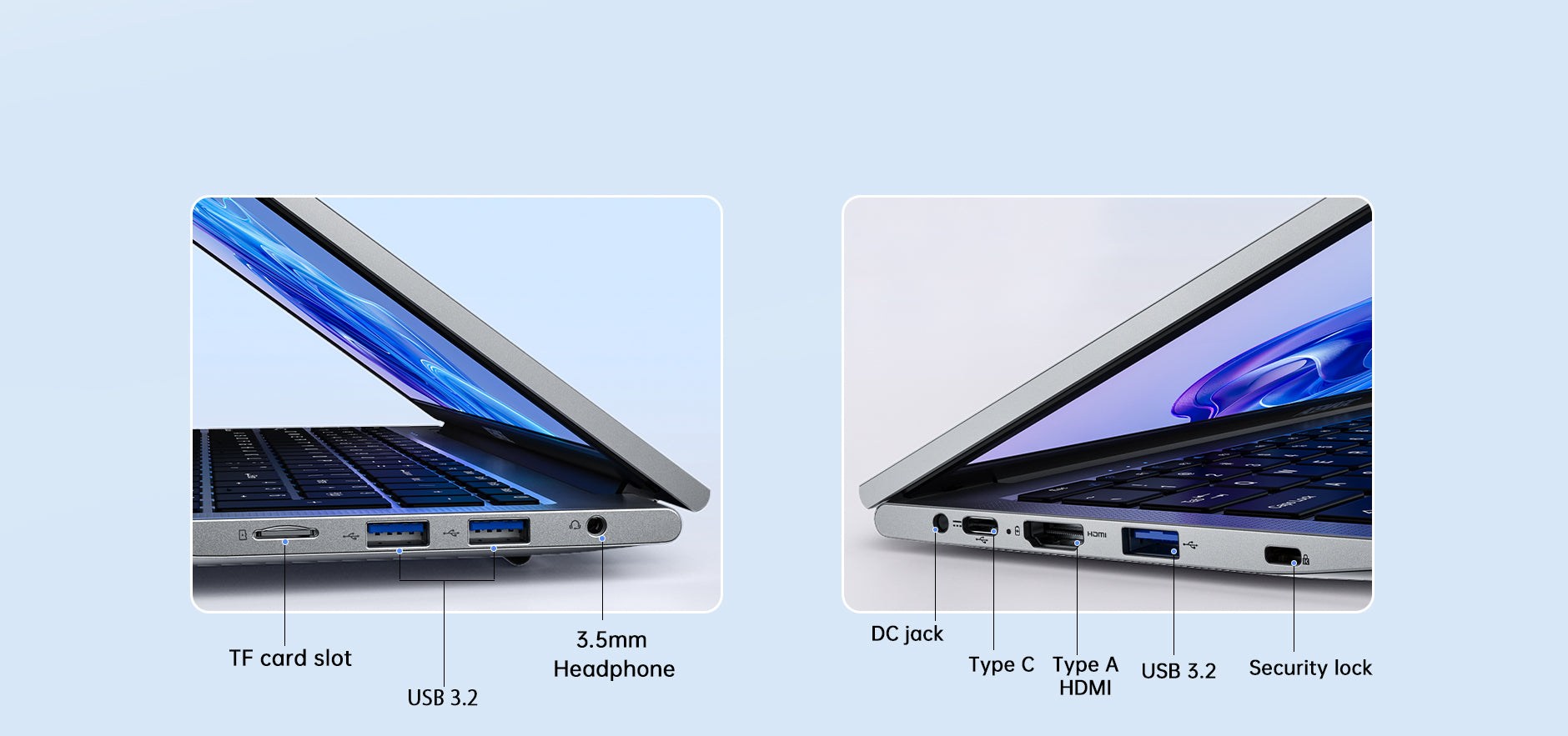 | Ports & Buttons | USB 3.2 *3 3.5 mm headphone jack *1 DC input *1 HDMI 1.4 *1 Type-C (Data) *1 TF *1 |