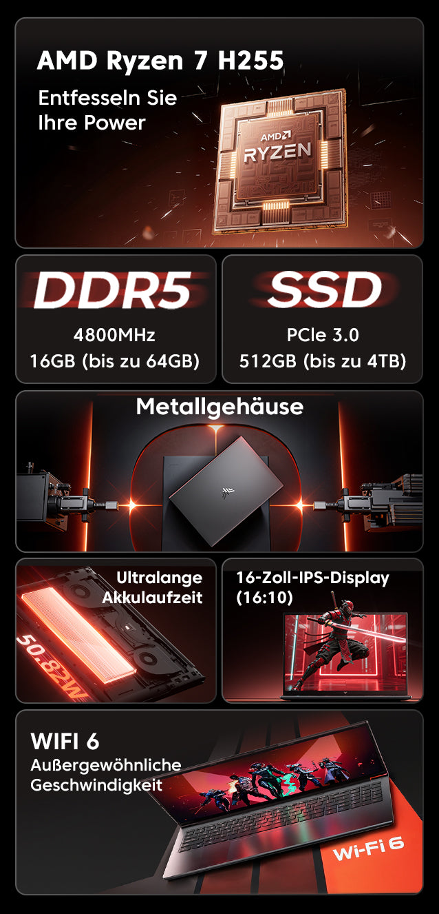 Das neue Notebook ACEMAGIC RX16 ist mit dem AMD Ryzen 7 H255-Prozessor ausgestattet, dessen Turbo-Frequenz bis zu 4,9 GHz erreichen kann. 16 GB DDR5 RAM und eine 512 GB SSD sorgen für reibungslosen Alltagsgeschäftsvorfall, und das RAM kann auf bis zu 64 GB erweitert werden, die SSD auf bis zu 4 TB. Ein 16-Zoll-IPS-Display im Format 16:10 verbessert die Arbeitsproduktivität und das Surferlebnis.