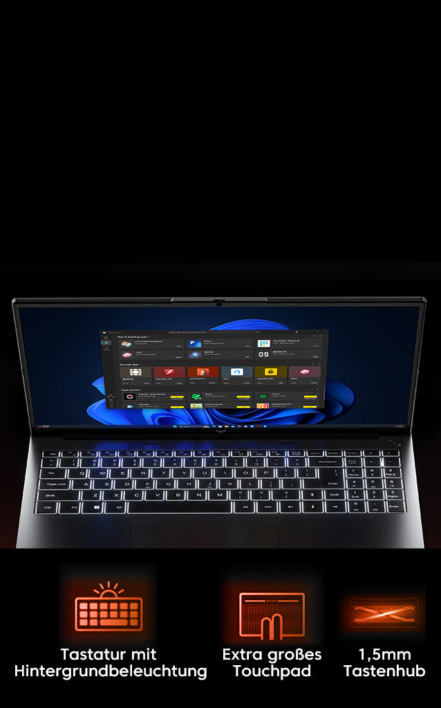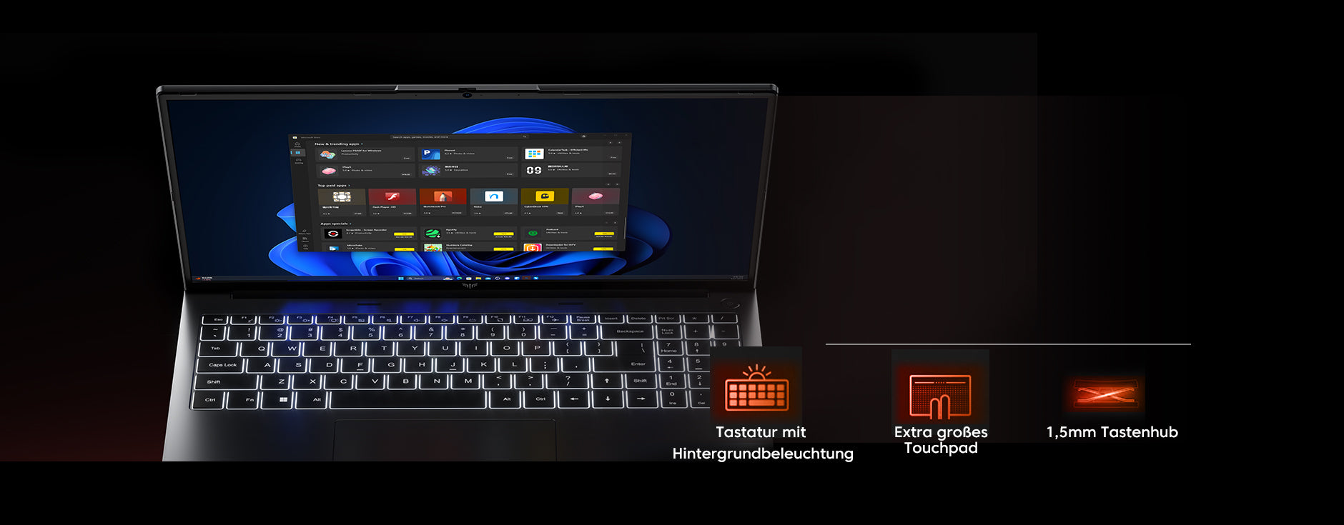 Alle Laptops verfügen über ein QWERTY-Tastaturlayout und sind mit einer mehrsprachigen Tastaturmembran (Deutsch, Französisch, Italienisch und Spanisch) ausgestattet.