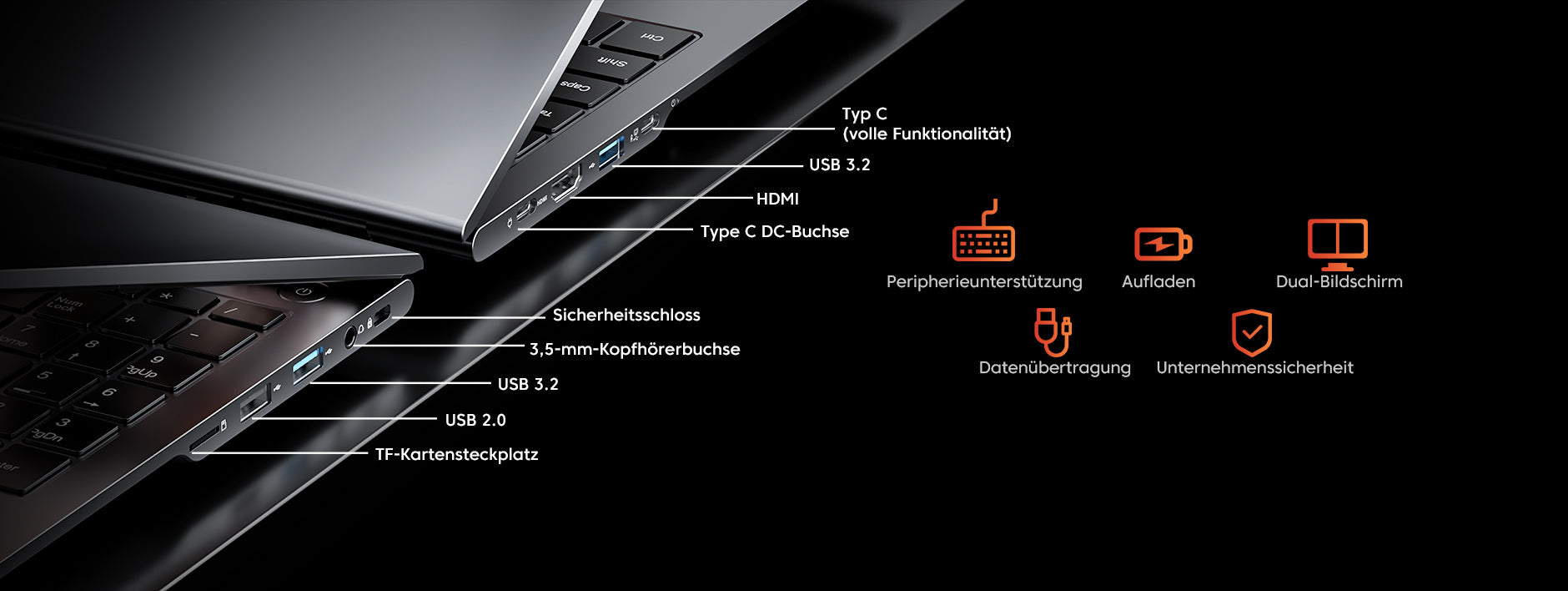 USB 3.2*2 Gen 1, USB 2.0*1 3,5-mm-Standardkopfhörerbuchse*1 Typ-C-Stromanschluss*1 HDMI 2.0*1 USB 3,2 Typ-C*2, Gen 2 (PD-Laden/DP1.4, 8K@60Hz/20Gbps Datenübertragung) TF-Kartensteckplatz*1 |