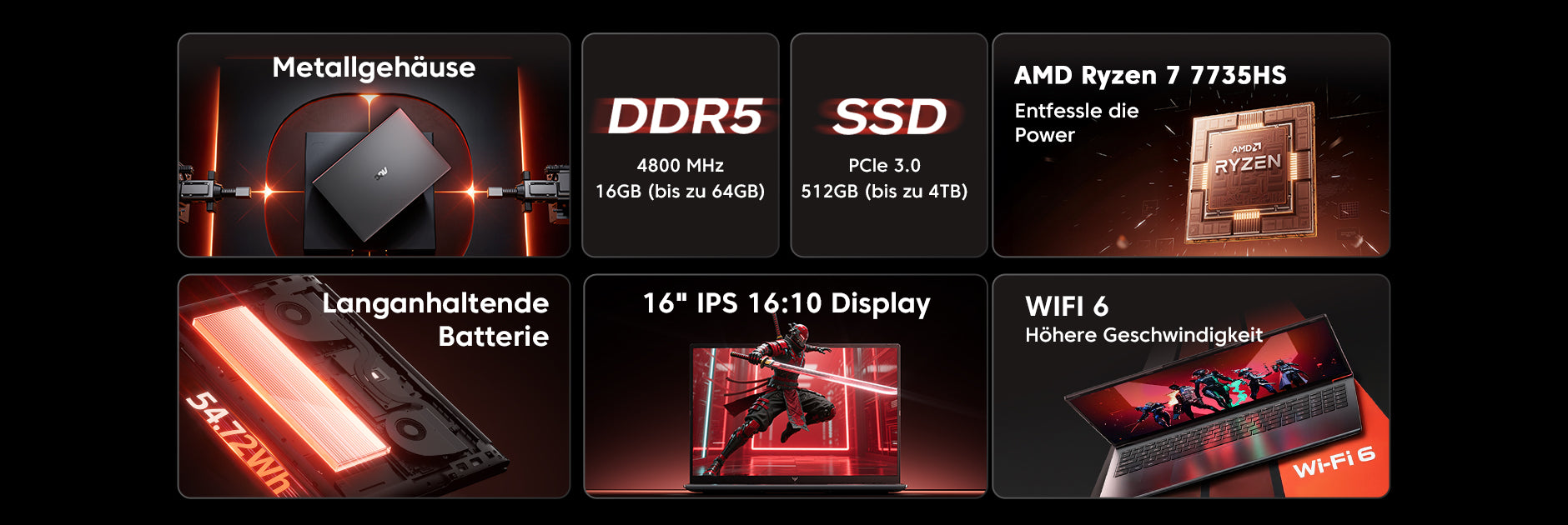 | Prozessor | AMD Ryzen™ 7 7735HS Prozessor 8 Kerne/16 Threads 3,2 GHz – 4,75 GHz Zen 3+ Architektur, TSMC 6 nm FinFET-Prozesstechnologie, 16 MB L3-Cache |